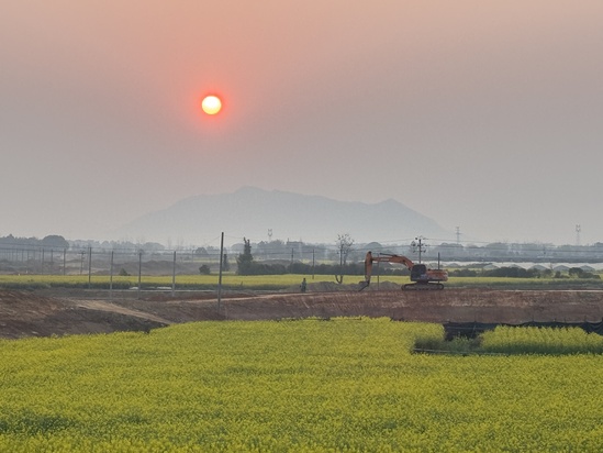 三月,樂(lè)安河畔的油菜花率先揭開了春的序幕。那金黃的波浪從丹霞山腳一直蔓延到尚未完全醒來(lái)的河灘,與工地赭紅的土方形成一場(chǎng)溫柔而有力的對(duì)話——那是自然與人力共同執(zhí)筆的早春寫意。春雨如絲,細(xì)細(xì)落下,浸潤(rùn)著新剝離的黏土層,黑亮的土壤在晨光中泛著油潤(rùn)的光澤,像一幅剛剛鋪開的生宣,等待著書寫新一季的豐饒。